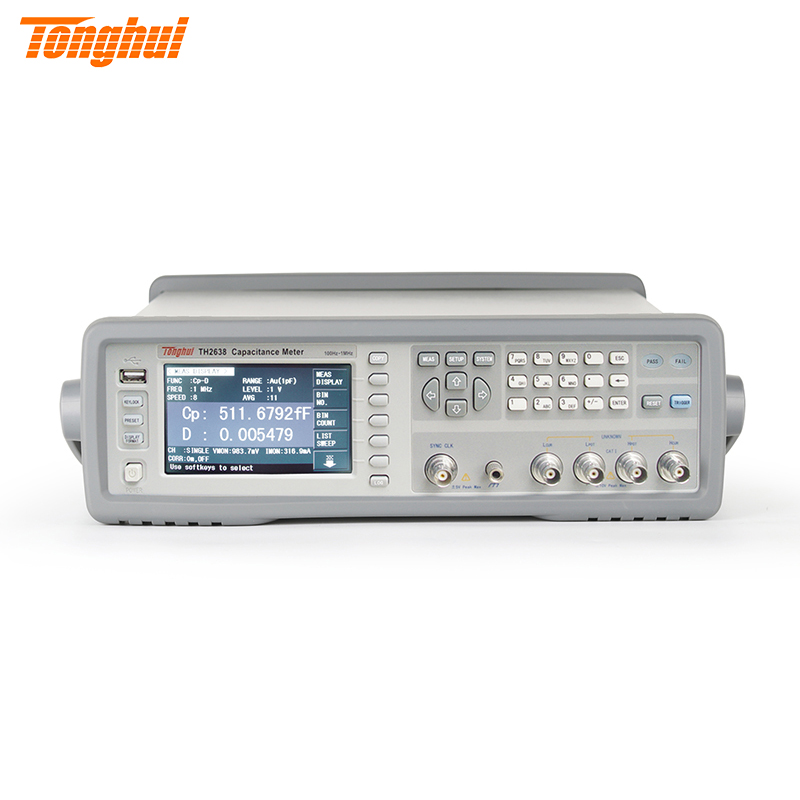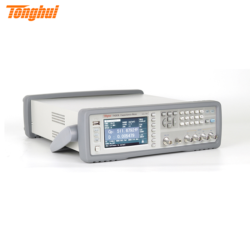 TH2638 是用于陶瓷电容生产测试的一款电容表。TH2638 可用于在频率 100Hz,120Hz, 1kHz,10kHz,40kHz, 100kHz,1MHz 和测试信号电平(0.1V ∼1V)对陶瓷电容作出评估。