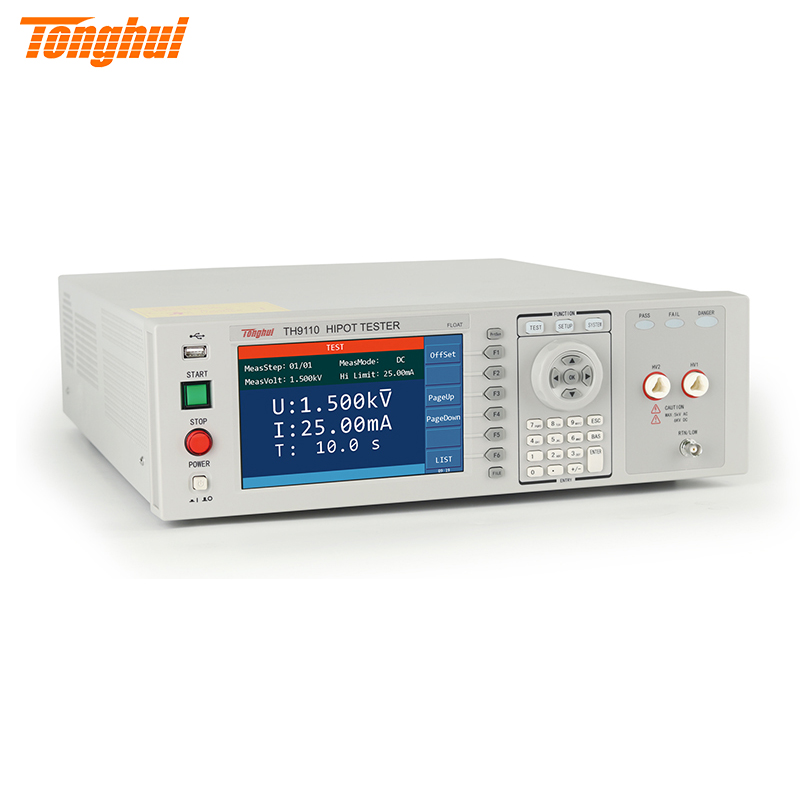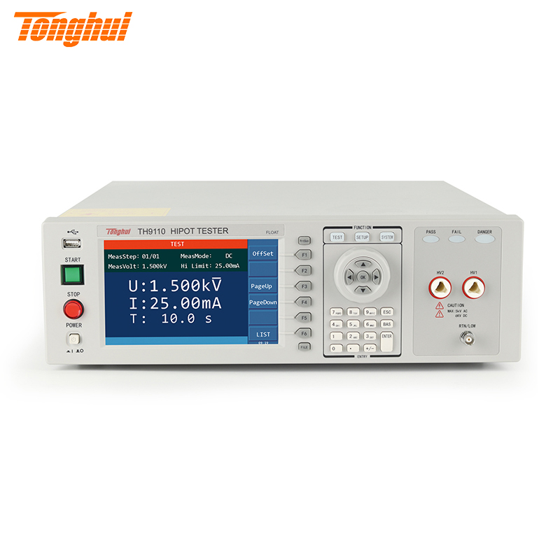 ■ TH9110/TH9110A是集同惠多年电气安规测试仪的设计经验,新推出的具有500VA功率,最大输出交流5kV/100mA的新一代交直流耐压/绝缘电阻测试仪,符合大功率耐压测试需求,符合EN50191的设备安全标准。TH9110/TH9110A系列除了基本的交流、直流、绝缘电阻测试外,增加了崩溃电压测试功能,可分析产品的击穿点电压,满足特定客户对产品高压可靠性检测的要求; 具有开短路检测功能,解决了用户在测试安规产品时的可靠性和准确性问题,输出时同步进行接触检查,避免漏检,提升测试可靠度与效率。TH9110/TH9110A使用7寸LCD彩色显示器,测试结果用大字符显示,更加清晰直观,方便操作与判断。高压浮动输出设计、触电保护功能等,确保了客户在接触到高压测试端的时候也不会被电击伤害,保证操作人员的人身安全。