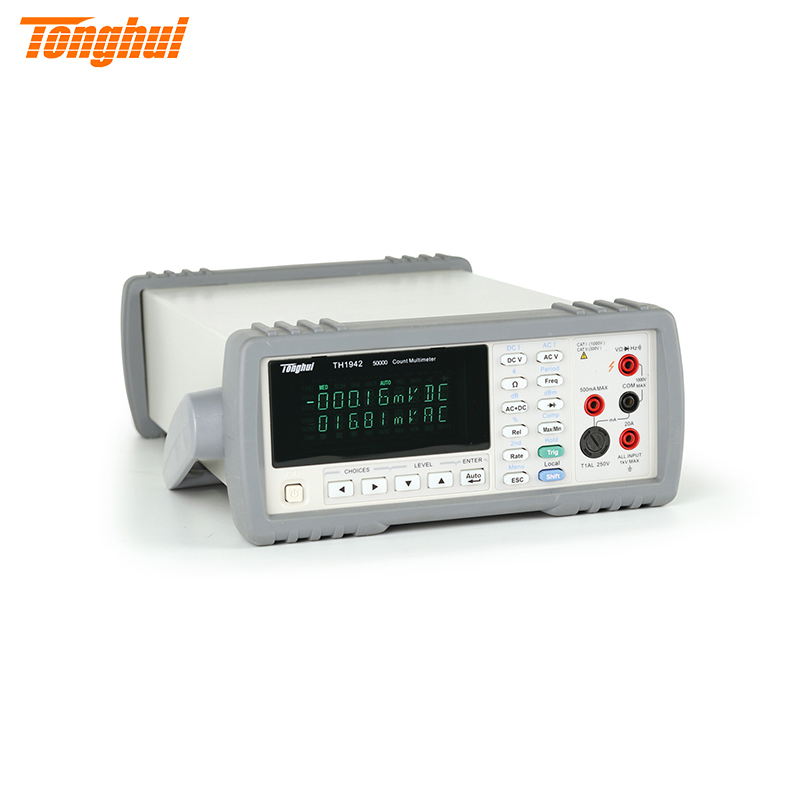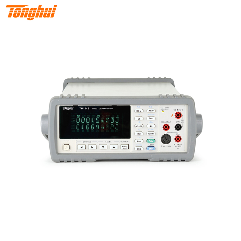 ■ TH1941型 4 1/2位真有效值数字多用表及TH1942型50,000读数数字多用表是一种多功能、高性价比的电压/电流/电阻测试仪器。仪器可以比同档产品高数倍的测量速度进行稳定测量。提供21,000/51,000字最大读数,0.03%/0.02%的最高直流电压准确度等一系列优良的性能和经济的价格为广大客户提供最优的选择。TH1941/TH1942提供高亮度VFD双显示器,可同时测量显示交流/直流电压或电流、交流电压/电流和频率等参数,不仅大大提高了测量效率,而且测试显示一目了然。机内采用SMD器件以减小整机密度,降低体积。 仪器配备标准的USB通讯接口,同时可提供通用的通讯软件以满足与计算机通讯、数据分析、统计、构建自动测试系统的需要。仪器接受SCPI(可编程仪器的标准命令)命令,以保证通讯软件的兼容性。