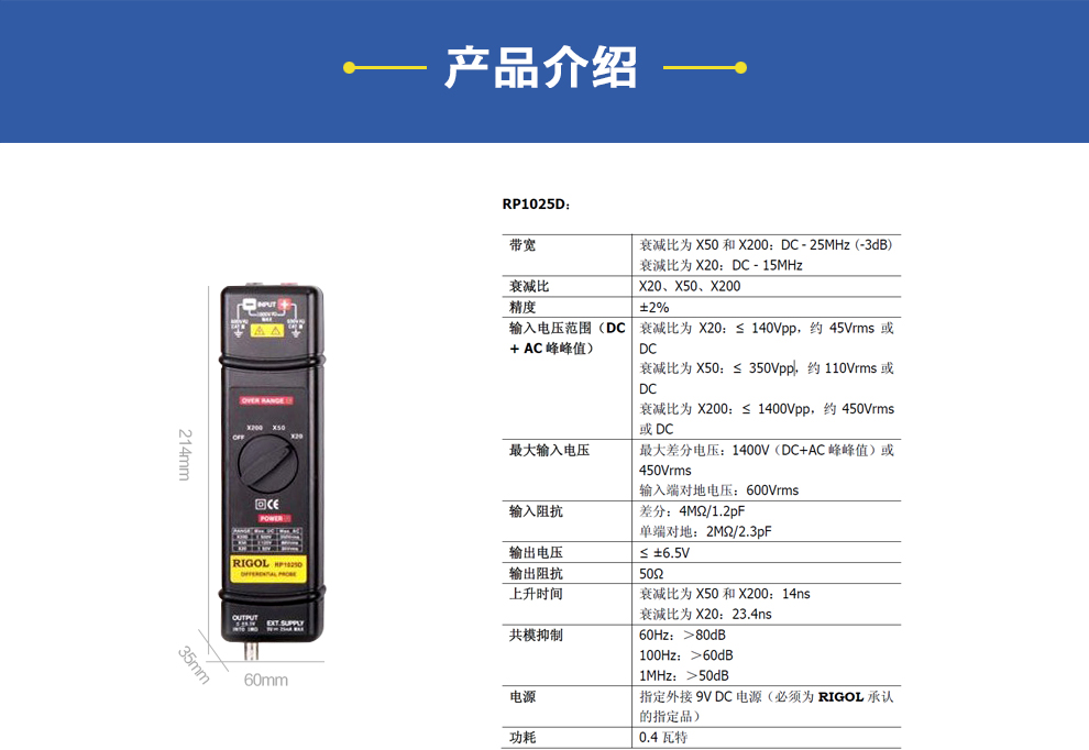 商品名称:Rigol,RP1025D,25MHz,1.3KV高压差分探头