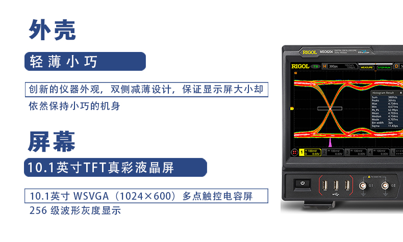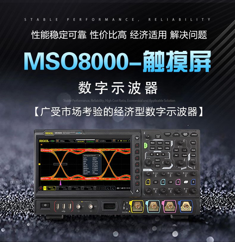 Rigol示波器,MSO8104,1 GHz带宽,10 GSa/s采样率,500 Mpts存储深度,4模拟通道+16 数字通道